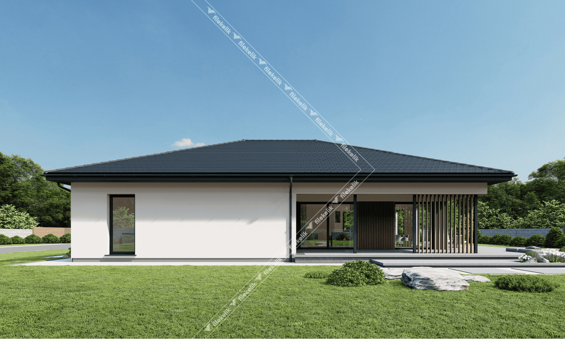 Daha yüksek ön kapı ve entegre garajın kapalı giriş alanına sahip açılı bungalov. Garaja içeriden ve dışarıdan erişilebilir. Oturma odasındaki sürgülü veranda kapısından erişilebilen kapalı teras. Daha yüksek pencerelere sahip daha yüksek zemin kat, bitişik mutfağa sahip açık plan bir oturma / yemek alanı olarak tasarlanmıştır. Mutfaktan ve dışarıdan erişilebilen teknik oda. Giriş holü, koridor, misafir tuvaleti, biri ebeveyn banyolu ve giyinme odalı olmak üzere üç yatak odası. Geniş çatı çıkıntıları 80 cm olan kırma çatı, çatı eğimi 22° veya 45° derece.