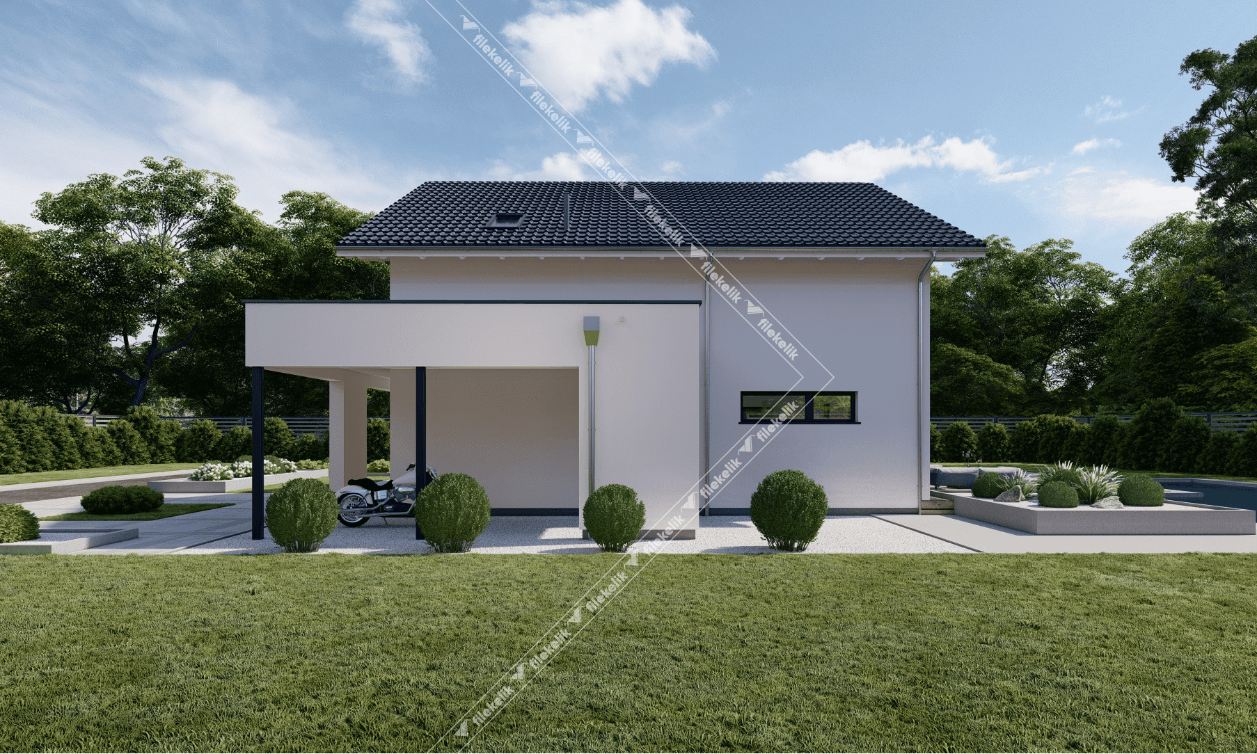 Dört odalı bungalov, giyinme odası, vestiyer, açık mutfak, kiler, banyo, misafir tuvaleti, teknik oda, koridor ve koridordan oluşmaktadır. Entegre giriş ve teras çatı kaplaması olan bu ev. 22° veya 45° çatı eğimine sahiptir. .